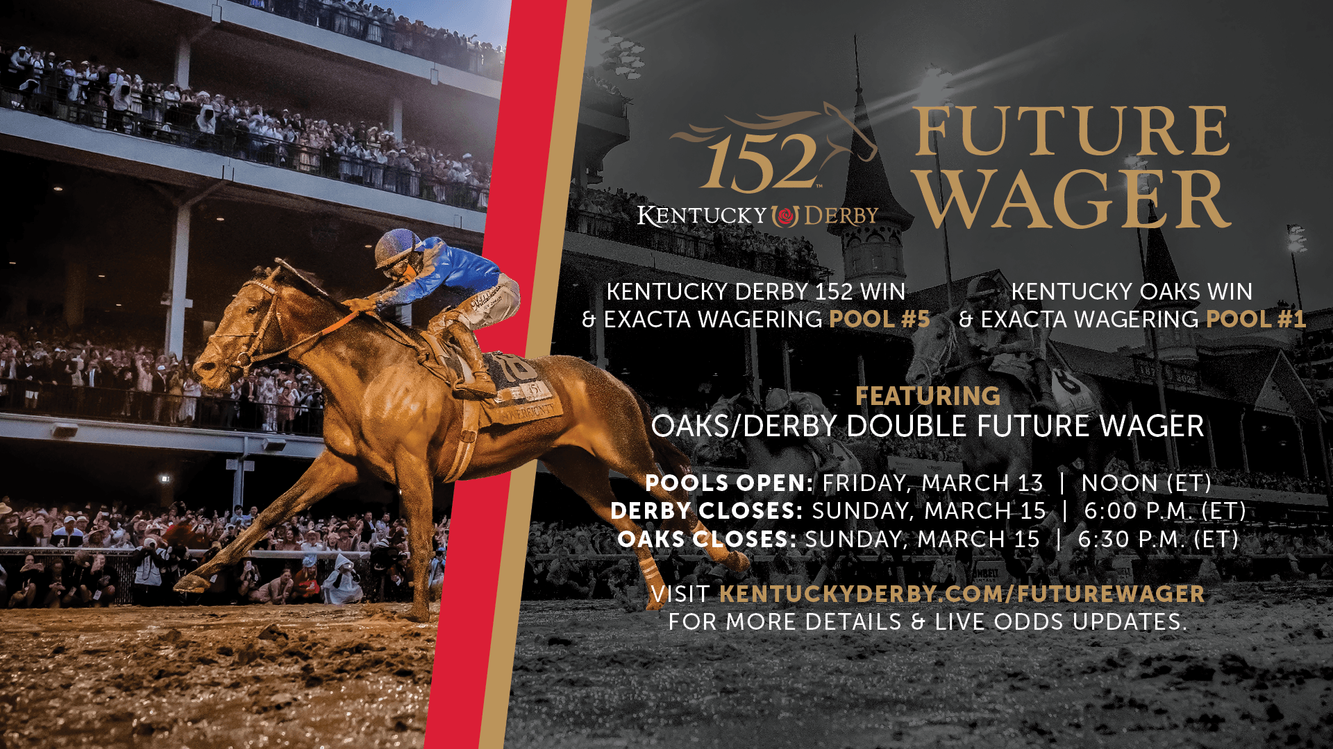 Both pools feature $2 Win and Exacta wagering, as well as a separate Oaks/Derby Future Double linking selections in both races. The Kentucky Derby Future Wager closes Sunday at 6 p.m. (all times Eastern) while the Kentucky Oaks Future Wager remains open until 6:30 p.m.